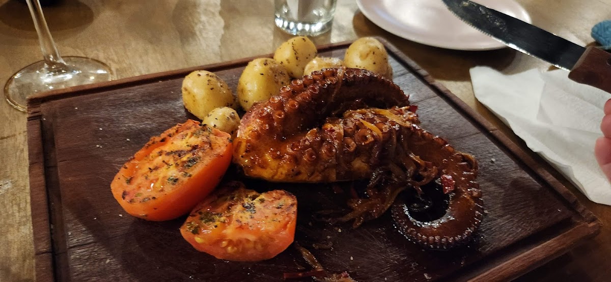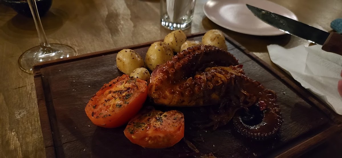 Went here as our "fancy" dinner on our trip. Such a cute place, we loved the atmosphere. There was a chef grilling the meat and seafood on an outdoor grill. They served toasted bread with a olive tapanade that was delicious. My husband and I both ordered steaks that were cooked perfectly and absolutely delicious. They also came with baked potatoes, and the potatoes were so good! Our server was so kind and another server offered to take pictures of us which was nice.